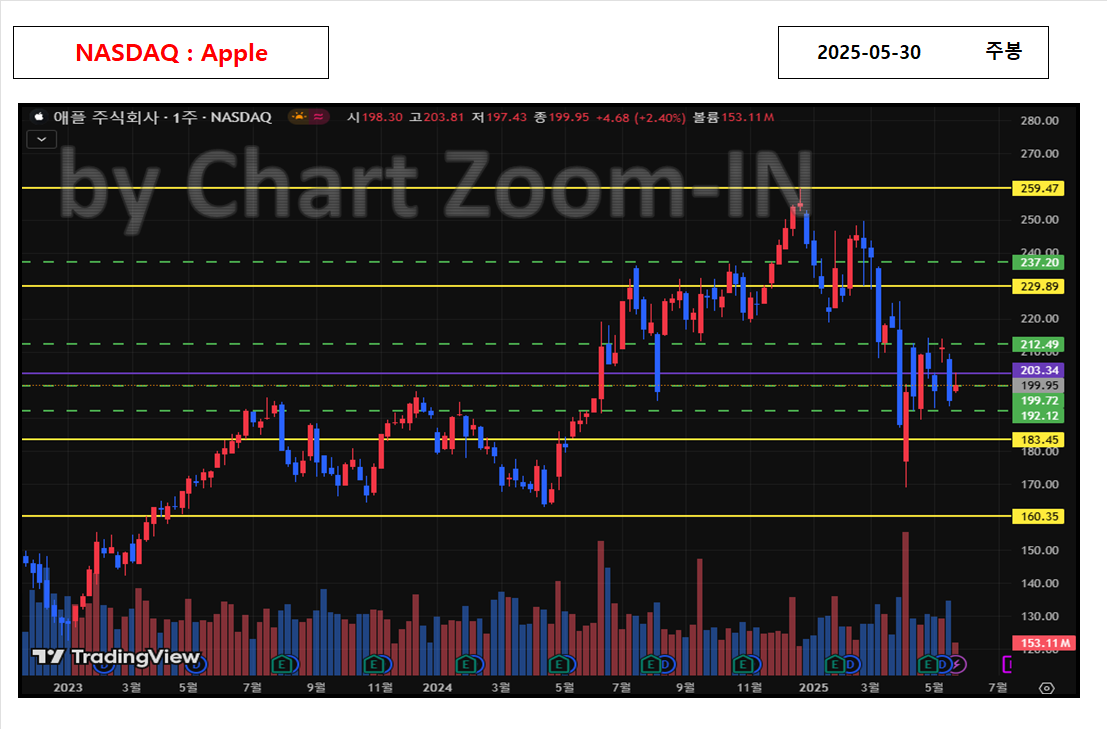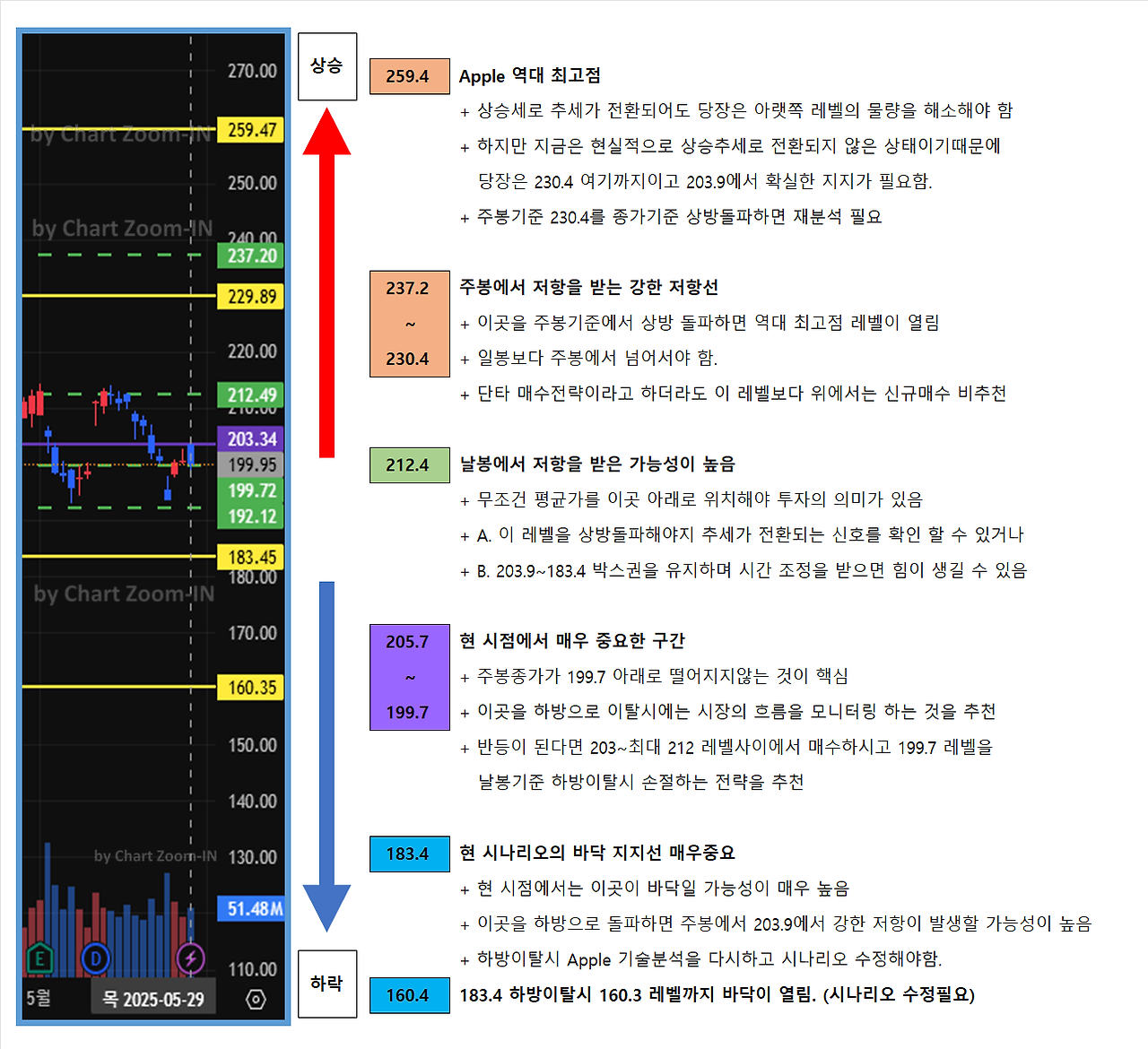 3. 차트줌인의 투자전략에 대한 소견 Apple은 현재 역대 최고점에서의 조정을 겪으며 $199.70 ~ $183.40 구간이라는 매우 중요한 기술적 지지선에 도달해 있습니다. 차트줌인의 관점은, 이 구간의 방어 여부가 향후 주가 방향을 결정하는 핵심 변곡점이 될 것입니다.
