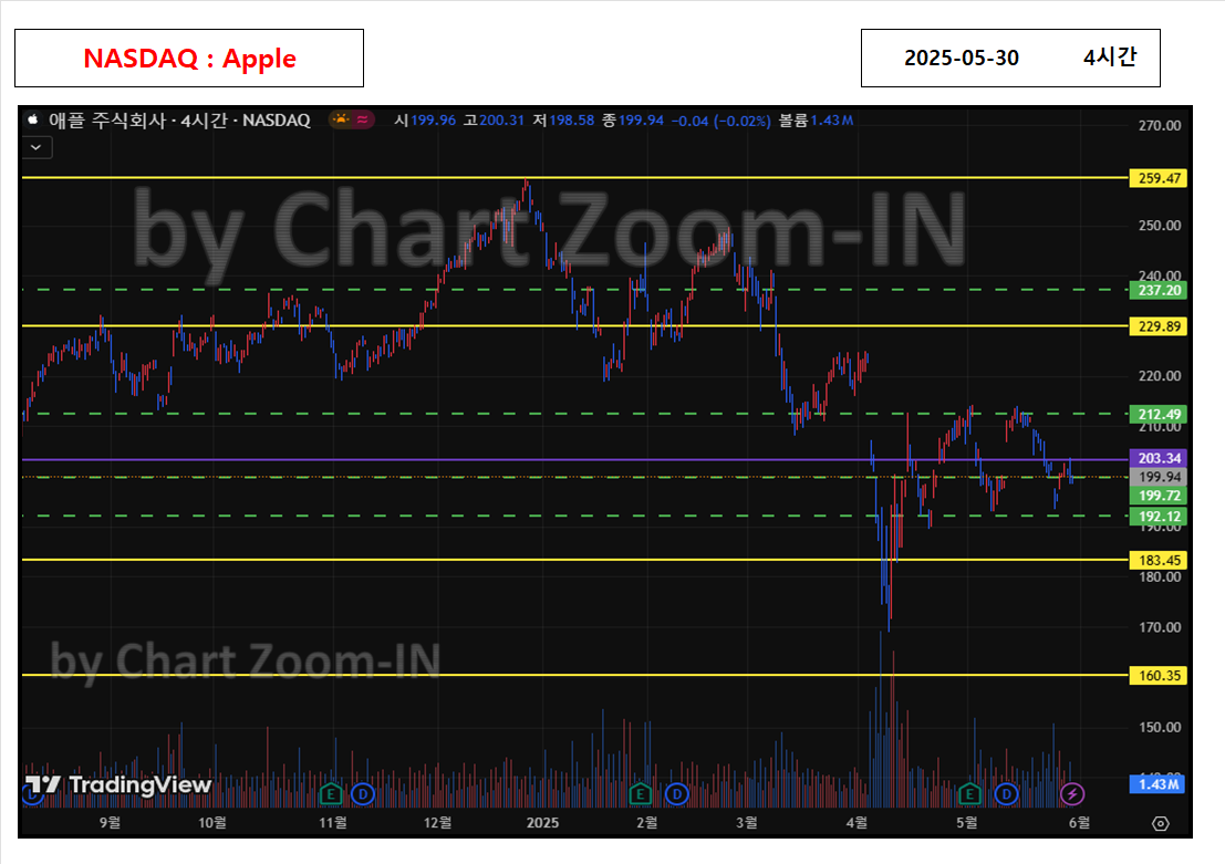 오늘, 2025년 5월 30일 나스닥에 상장된 Apple(NASDAQ: AAPL)의 핵심적인 주가 움직임을 차트 기술적 분석을 통해 브리핑해 드리겠습니다. 현재 Apple 주가는 역대 최고점 $259.40 부근에서 최근 조정을 받으며 중요한 지지선 구간에 진입하고 있습니다.