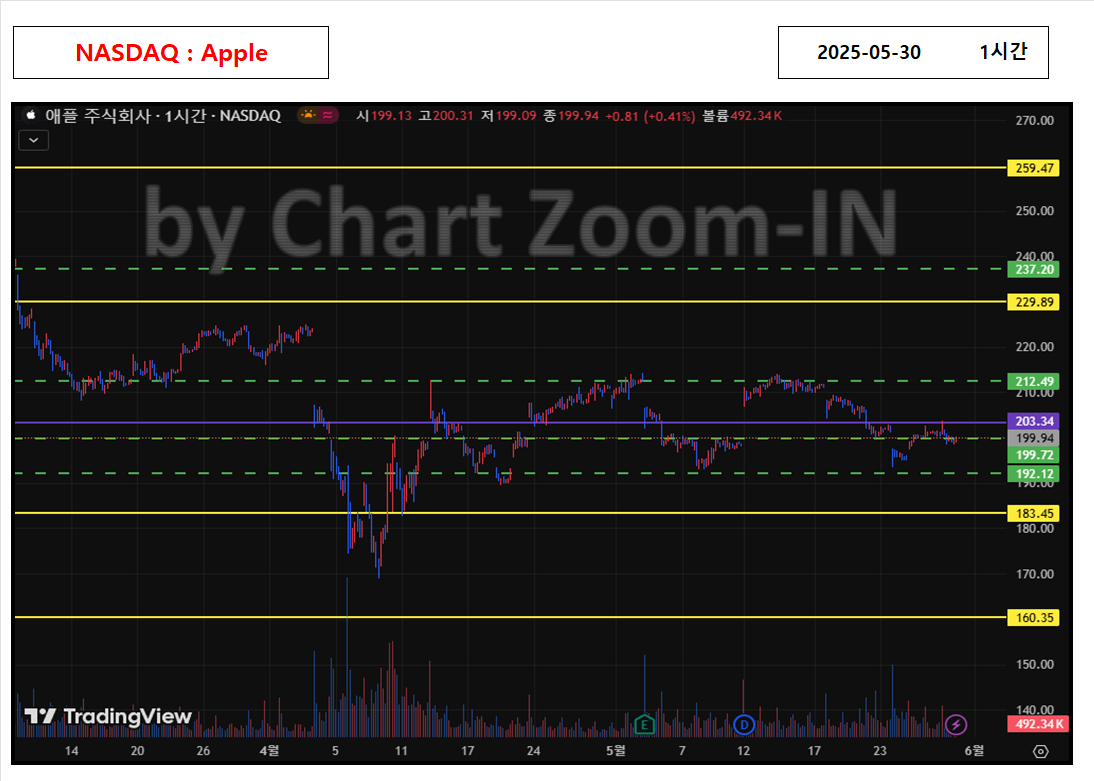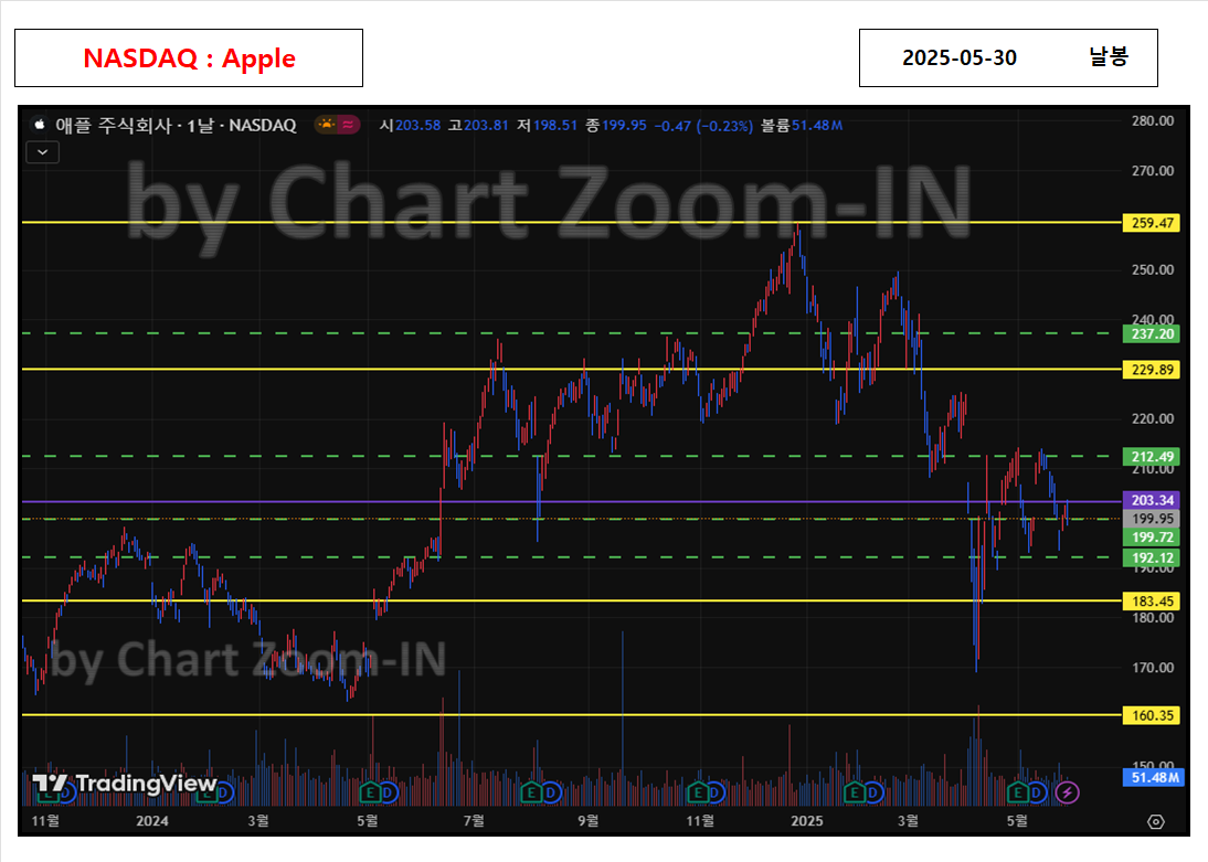 본 브리핑은 2025년 5월 30일 라이브 차트와 여러 기술 지표로 분석한 Apple 차트 분석 자료를 기반으로, 주요 기술적 지지·저항선을 파악하고 향후 주가 움직임에 대한 시나리오를 전문가의 시각으로 제시해 드리고자 합니다.