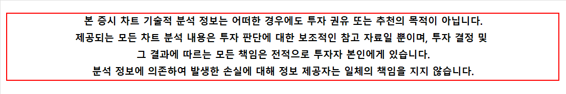 본 증시 차트 기술적 분석 정보는 어떠한 경우에도 투자 권유 또는 추천의 목적이 아닙니다. 제공되는 모든 차트 분석 내용은 투자 판단에 대한 보조적인 참고 자료일 뿐이며, 투자 결정 및 그 결과에 따르는 모든 책임은 전적으로 투자자 본인에게 있습니다. 분석 정보에 의존하여 발생한 손실에 대해 정보 제공자는 일체의 책임을 지지 않습니다.