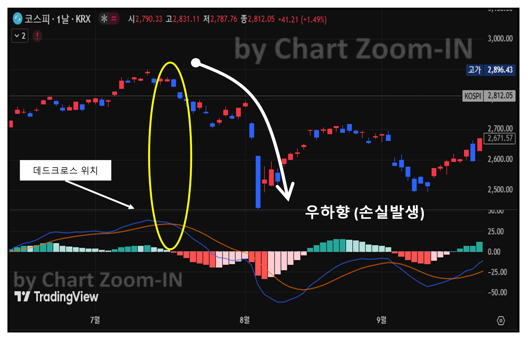 - 데드 크로스: MACD선이 시그널선을 하향 돌파하면 매도 신호로 해석합니다.