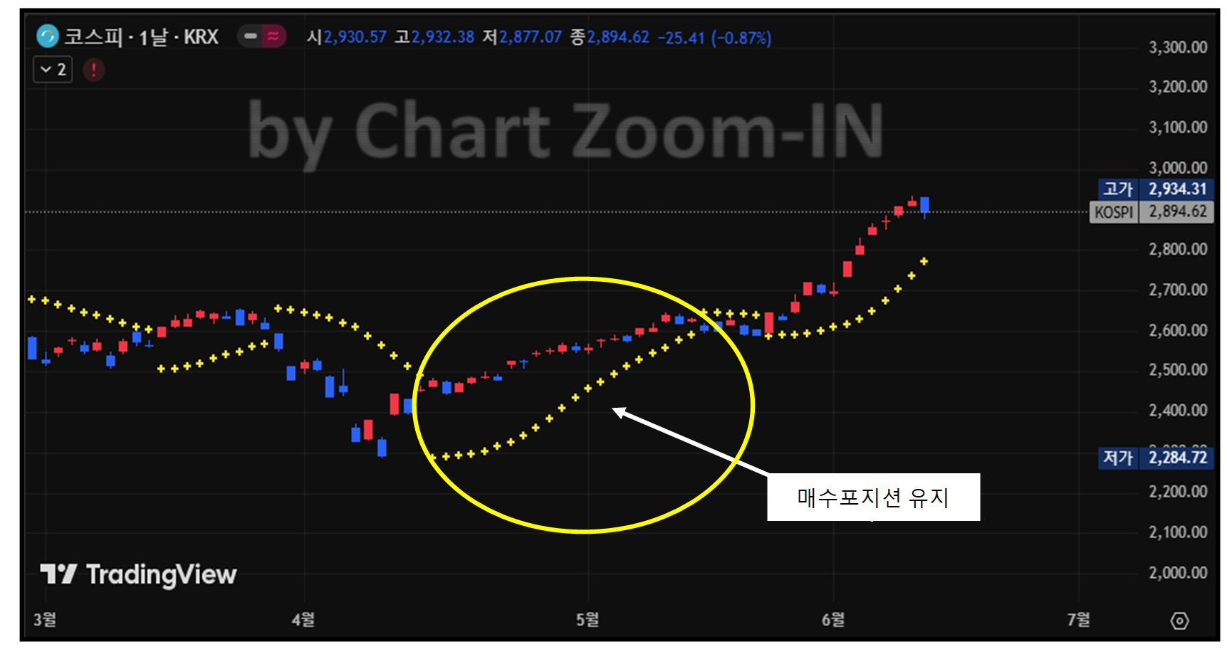 - 점이 주가 아래에 있으면: 주가가 상승 추세에 있음을 나타냅니다. (매수 포지션 유지)