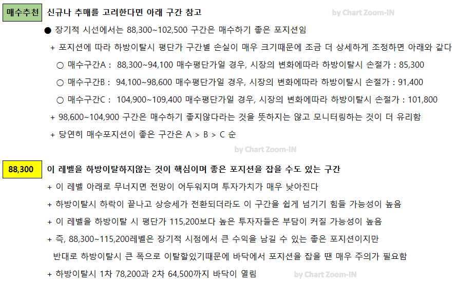 - 88,300원~115,200원 구간에서 하락을 멈추고 반등하는 것이 가장 좋습니다.