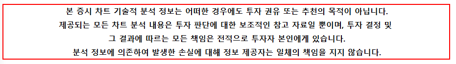 - 투자 책임: 본 증시 차트 기술적 분석 정보는 어떠한 경우에도 투자 권유 또는 추천의 목적이 아닙니다. 제공되는 모든 차트 분석 내용은 투자 판단에 대한 보조적인 참고 자료일 뿐이며, 투자 결정 및 그 결과에 따르는 모든 책임은 전적으로 투자자 본인에게 있습니다. 분석 정보에 의존하여 발생한 손실에 대해 정보 제공자는 일체의 책임을 지지 않습니다. 항상 고위험-고수익(High Risk, High Return)을 고려하고 전체 매수하지 마시고 분할 매수 및 분할 매도하시면서 상승 시의 이익 실현 대응 전략과 하락 시의 최소 손실 대응 전략을 가져가는 것이 중요합니다. 제시해드리는 매수 타점은 현시점 시장에서 가장 안전하게 투자할 수 있는 거래 타점을 의미합니다.