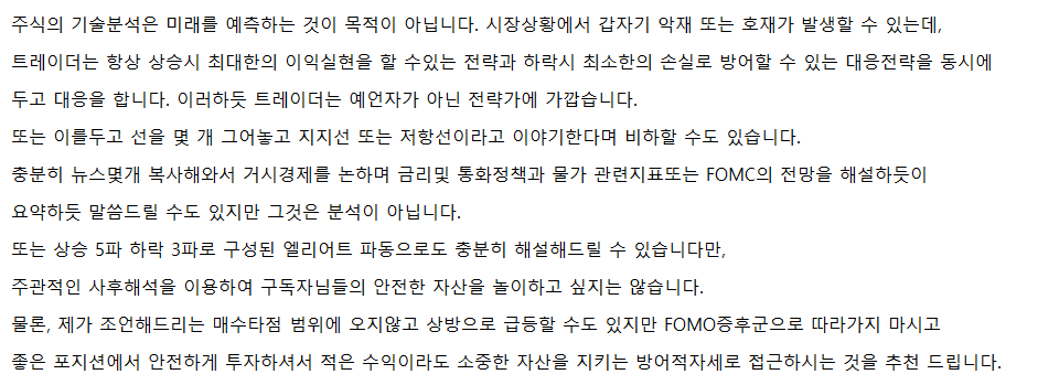- 기술적 분석의 한계: 기술적 분석은 주가 차트 패턴과 거래량 등 과거 데이터를 활용하며, 기업의 본질적 가치나 새로운 정보 반영에는 한계가 있을 수 있습니다.
