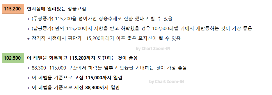 - 주봉 종가가 115,200원 레벨을 넘어 마감할 경우 의미 있는 상승 추세 전환이 가능합니다.