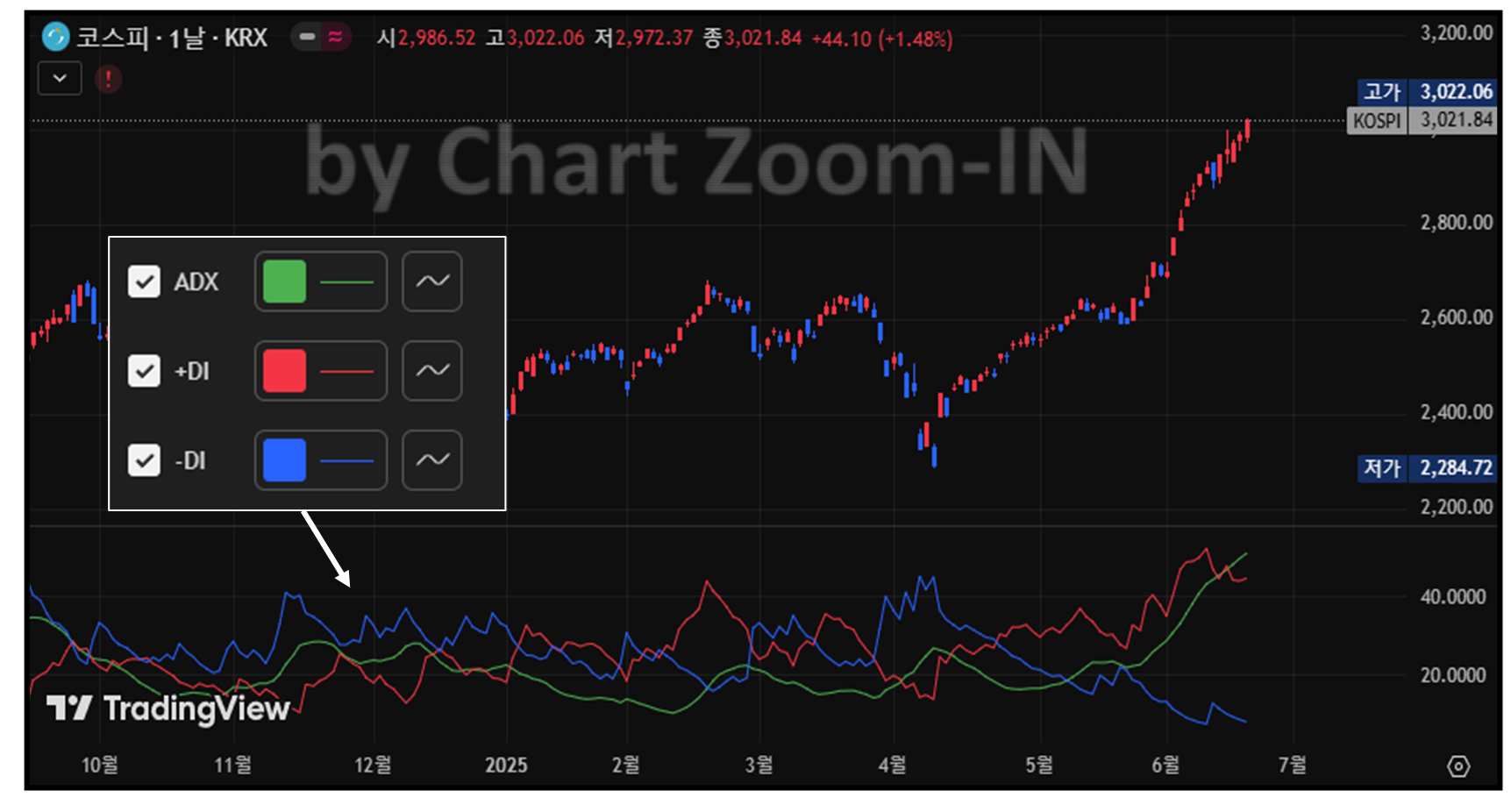 - 추세 방향 확인 (+DI, -DI 선):