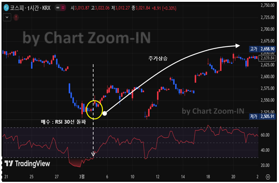 + RSI가 30 이하로 하락 후 다시 30 위로 올라올 때: 매수 신호로 해석될 수 있습니다.