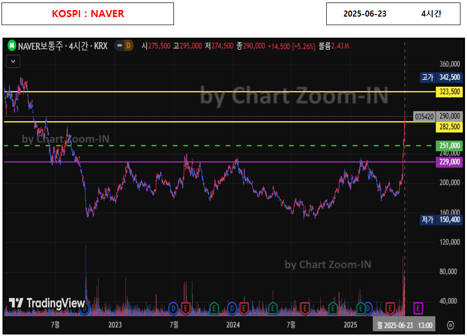 NAVER의 현재 주가는 290,000원입니다. 최근 강력한 상승세를 보이며 중요한 저항선들을 돌파했습니다. 현재 가격인 290,000원 레벨은 과거 저항으로 작용했던 구간이었으나 최근 강하게 돌파하며 새로운 지지선이 될 가능성이 있는 중요한 구간으로 판단됩니다.