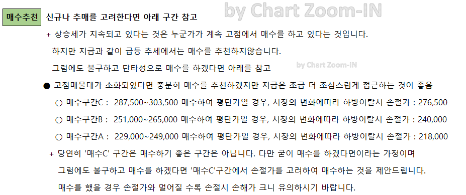 - 안정적인 매수를 고려한다면, 첫 번째 지지선인 282,500원 부근에서 지지 여부를 확인하거나, 좀 더 낮은 251,000원 ~ 229,000원 구간에서의 매수 기회를 기다리는 것이 유리할 수 있습니다.