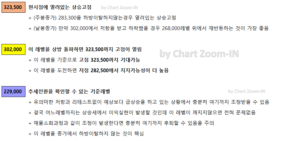 - 주봉 기준으로 323,500원 레벨을 돌파하고 안착한다면, 장기적인 상승 추세로의 전환 가능성이 높아질 수 있습니다.
