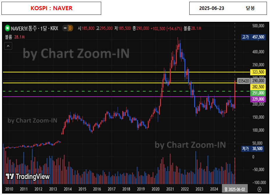 NAVER는 지난 2021년 10월 최고가 457,500원 기록 후 중장기 하락 추세를 지속하다가, 최근 급등 흐름으로 전환되었습니다.