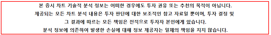 - 투자 책임: 본 증시 차트 기술적 분석 정보는 어떠한 경우에도 투자 권유 또는 추천의 목적이 아닙니다. 제공되는 모든 차트 분석 내용은 투자 판단에 대한 보조적인 참고 자료일 뿐이며, 투자 결정 및 그 결과에 따르는 모든 책임은 전적으로 투자자 본인에게 있습니다. 분석 정보에 의존하여 발생한 손실에 대해 정보 제공자는 일체의 책임을 지지 않습니다. 항상 고위험-고수익(High Risk, High Return)을 고려하고 전체 매수하지 마시고 분할 매수 및 분할 매도하시면서 상승 시의 이익 실현 대응 전략과 하락 시의 최소 손실 대응 전략을 가져가는 것이 중요합니다. 제시해드리는 매수 타점은 현시점 시장에서 가장 안전하게 투자할 수 있는 거래 타점을 의미합니다.