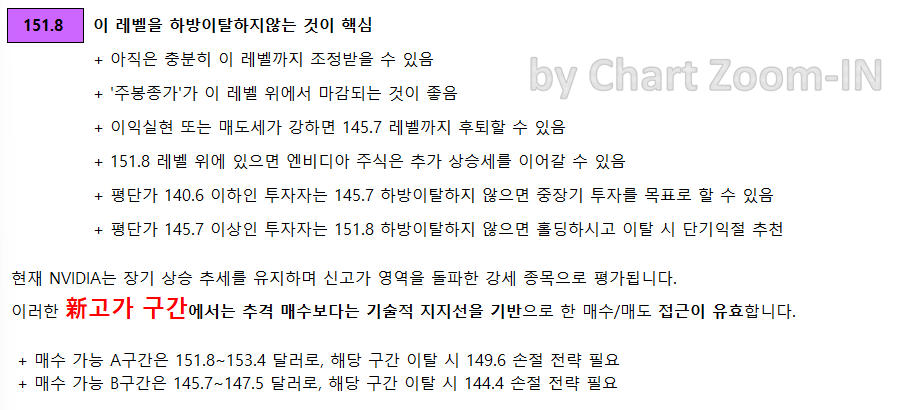 - $145.70 이상 투자자는 $151.80을 하방 이탈하지 않으면 홀딩하고, 단기적으로는 익절을 추천합니다.