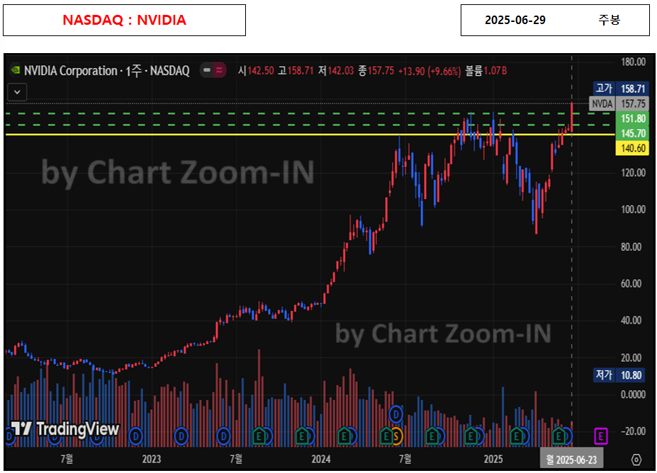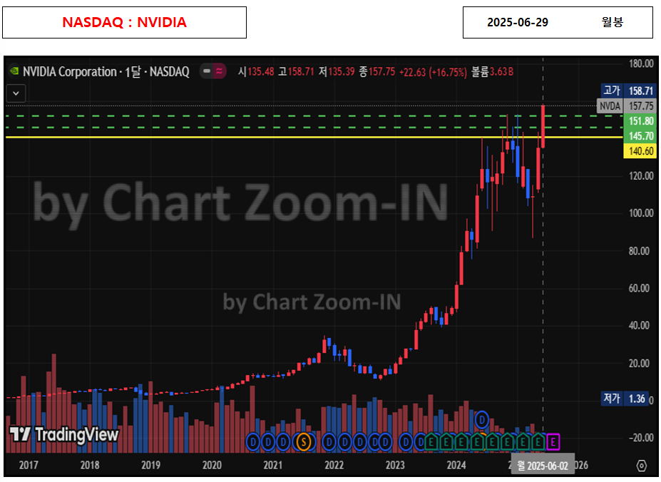NVIDIA는 최근 AI 반도체 및 고성능 GPU 수요 급증에 따라 급격한 주가 상승세를 기록하며, 2025년 6월 현재 역대 최고가를 갱신한 상태입니다. 특히 반도체 업종 전반의 강세 흐름과 기관·개인 투자자들의 매수세가 동반되면서 기술적 강세 구조를 형성 중이며, 각 차트 주기별로 상승 흐름이 정교하게 연동되고 있는 점이 특징입니다. 현재 구간은 신고가 영역이기 때문에 단기 조정과 중기 상승의 경계에 놓여 있으며, 차트 기반 매매 전략이 요구되는 시점입니다.