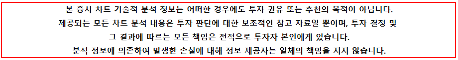 - 투자 책임: 본 증시 차트 기술적 분석 정보는 어떠한 경우에도 투자 권유 또는 추천의 목적이 아닙니다. 제공되는 모든 차트 분석 내용은 투자 판단에 대한 보조적인 참고 자료일 뿐이며, 투자 결정 및 그 결과에 따르는 모든 책임은 전적으로 투자자 본인에게 있습니다. 분석 정보에 의존하여 발생한 손실에 대해 정보 제공자는 일체의 책임을 지지 않습니다. 항상 고위험-고수익(High Risk, High Return)을 고려하고 전체 매수하지 마시고 분할 매수 및 분할 매도하시면서 상승 시의 이익 실현 대응 전략과 하락 시의 최소 손실 대응 전략을 가져가는 것이 중요합니다. 제시해드리는 매수 타점은 현시점 시장에서 가장 안전하게 투자할 수 있는 거래 타점을 의미합니다.