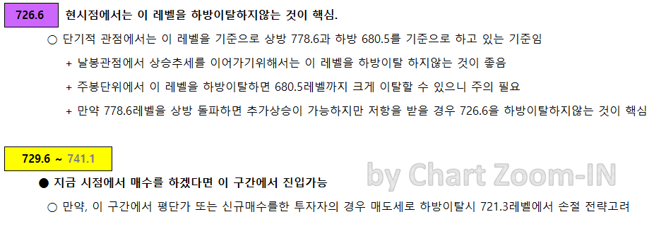 - 만약 778.6달러 레벨을 넘어서지 못하거나 저항을 받을 경우, 날봉 투자 관점에서 봤을 때는 726.6달러 레벨을 하방 이탈하지 않으면 문제되지 않고, 주봉 단위 투자 관점에서는 680.5달러 레벨 위에서 거래된다면 큰 문제가 되지 않을것으로 예상합니다.