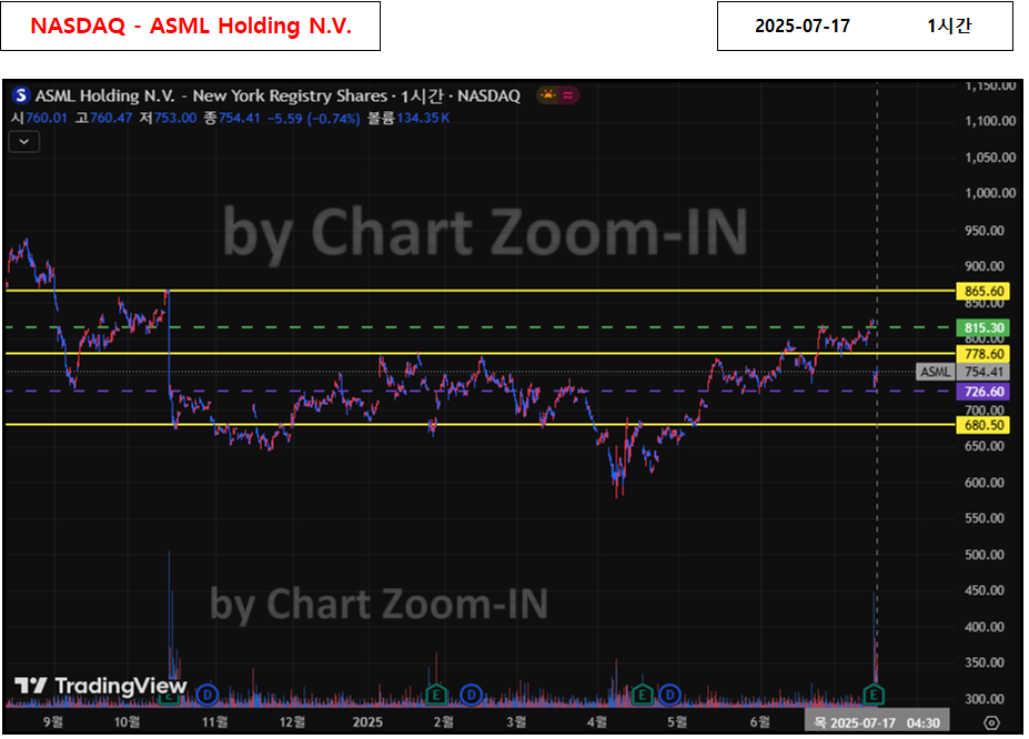 ASML 주가는 월봉상 여전히 견고한 장기 상승 추세를 유지할 수 있으나, 주봉, 일봉, 단기봉(4시간봉, 1시간봉)에서는 단기적인 조정 또는 횡보 추세에 있습니다. 현재 주가 754.40달러는 중요한 저항선인 778.6달러와 단기 지지선인 726.6달러 사이에 위치하고 있습니다.