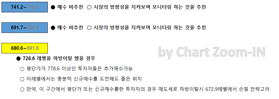 - 729.6달러 ~ 741.1달러 구간과 680.5달러 ~ 691.7달러 구간을 매수 가능 구간으로 확인할 수 있습니다.