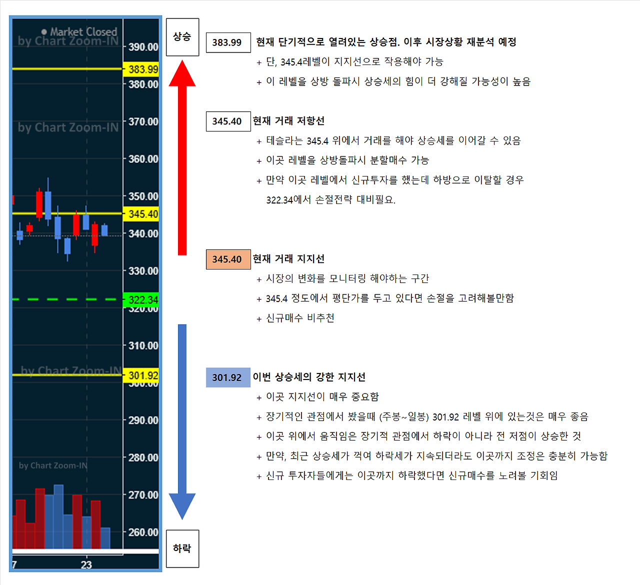 - 345.40 달러 (현재 저항선이자 중요한 거래 변곡점): 이 가격은 현재 테슬라 주가에 저항선으로 작용하며, 테슬라가 345.4 달러 위에서 거래를 해야만 상승세를 이어갈 수 있습니다. 이 레벨을 상방 돌파 시 분할 매수를 고려할 수 있습니다. 만약 이곳 레벨에서 신규 투자했는데 하방으로 이탈할 경우 322.34 달러에서 손절 전략 대비가 필요합니다.