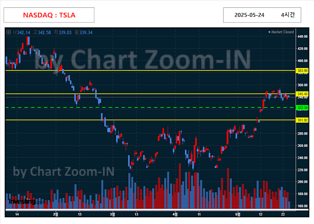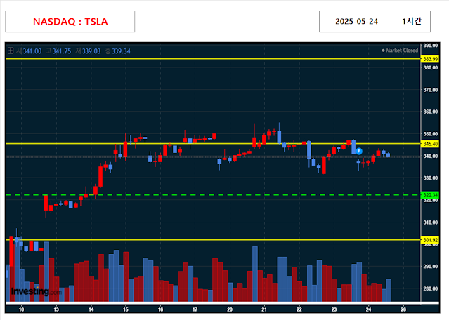 현재 테슬라 주가는 345.40 달러 저항/지지선과 301.92 달러 지지선 사이에서 단기적 관점에서 유의미한 거래구간을 확인했습니다. 기술적으로는 상승 추세가 이어질 가능성이 있지만, 시장 상황과 거시 경제 변수, 그리고 테슬라 자체의 이슈들을 종합적으로 고려하여 신중하게 투자 결정을 내리시기를 권고드립니다.